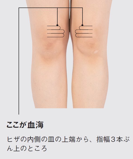 血海の「血」は血液や血流を意味しています。その名のとおり血液の集まる場所です。そのため、ホルモンのバランスを整え、血行不良、血が不足しているといった婦人科系の症状改善に効果を発揮します。冷え症、貧血気味の人にもおすすめです。