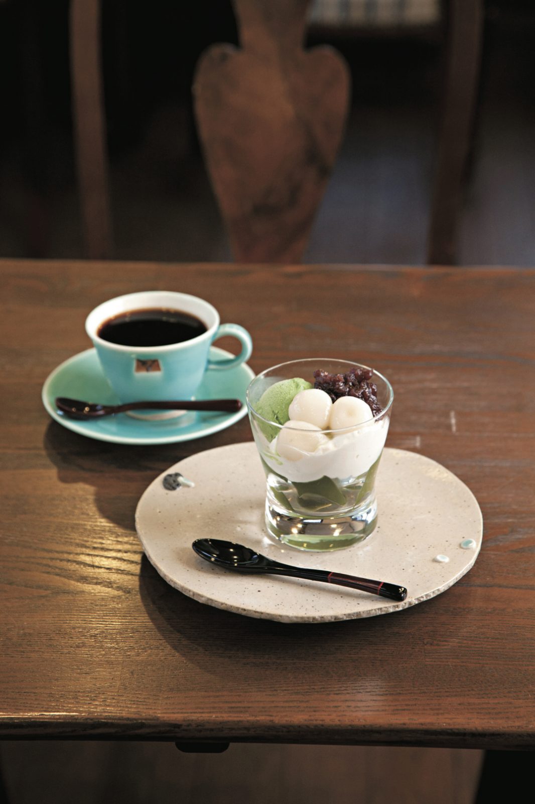 歩き疲れたら、アンティークの椅子や家具を配し、ゆったりした空気が流れるカフェでひと休み。店名の由来は道路を挟んだ隣の敷地、廻船問屋「内田家」の本家跡に残るタブノキから。地元福井の作家の作品展示・販売も行っているので、うつわ好きはぜひ立ち寄ってみて。