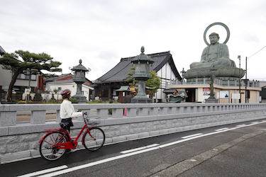 高岡が誇る銅製鋳物で造られた大仏様や国宝寺院、風情ある金屋町、山町筋の街並み、そしてセンス、美意識あふれる個性的な店々……。点在する名所・見どころをくまなく回れたのも、機動力がある自転車のおかげ!