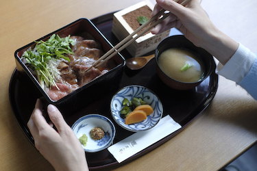 旅の最後はやっぱり美味しい料理と美味しいお酒で締めくくりたい!ということで、同店自慢の「とやま和牛〈酒粕育ち〉の炭火焼ローストビーフ重(並盛2,500円)」をオーダー。日本酒は、2023年8月に発売したばかりの「itonami彩sai」を。
