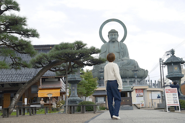 まず向かったのは、「高岡大仏」。この大仏様は、街なかに鎮座するかのようなそのロケーションが大きな特徴。大佛寺というお寺の境内に配置されていますが、大仏様をさえぎるものがなく、遠くからでもその姿を拝むことができます。