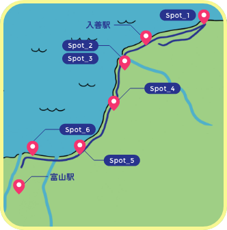 新潟との県境に近い入善駅をスタートし、ゴールの「酒商 田尻本店」までは約40km。富山の雄大な自然に抱かれ、思う存分ツーリングが楽しめるコースです。
