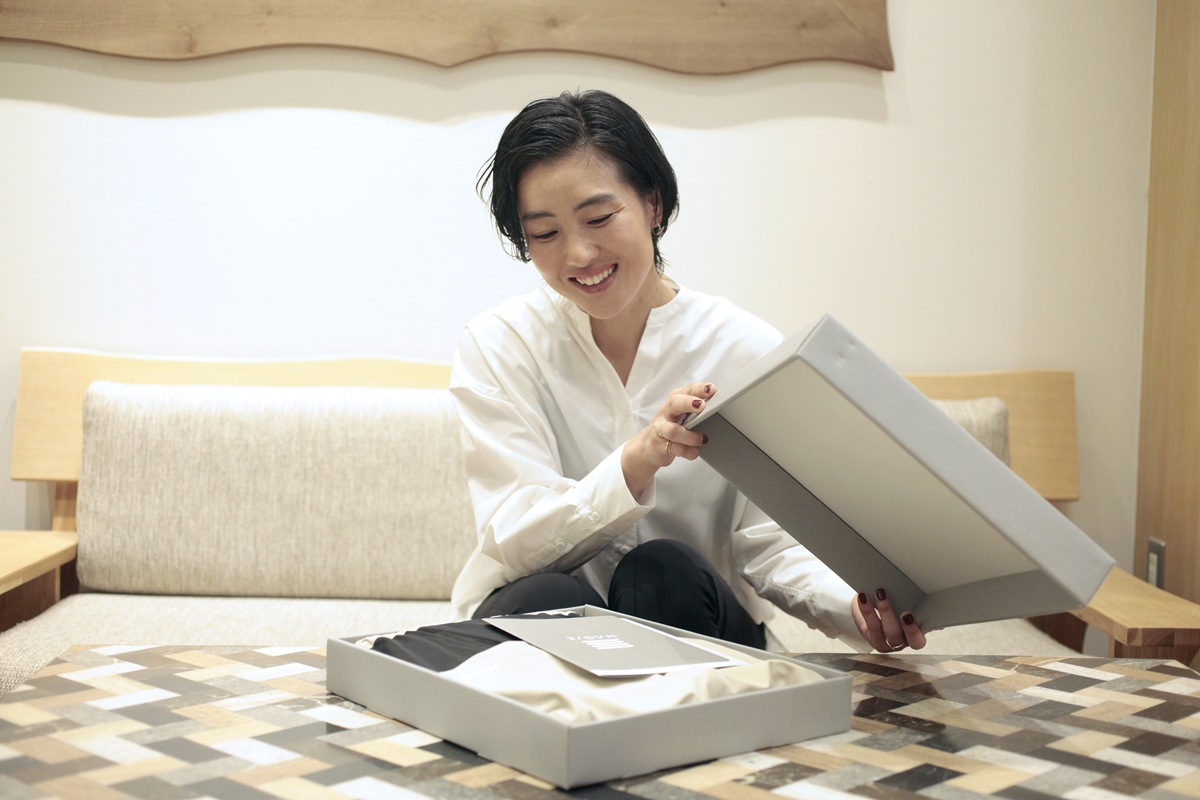 それぞれの製品は、受注後に一枚一枚作り上げるのも特徴。ムダを排除し、手に取った人に大事に着てもらうために、すべて限定受注生産のシステムを実現。オーダー後、再生紙を使った箱で送られてくる一枚は、単なるヨガウエアではなく、私達の意識変革へのスイッチ。「NAGIE」を身にまとうことで、本当に必要なものに意識が集中していく。