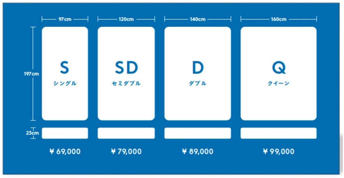 インターネットの販売と直接配送で無駄な費用を徹底的にカットしているからこその、リーズナブルな価格。上質素材と高機能にこだわり、最上級のマットレスを適正価格で購入可能ってところもとても嬉しい。価格とサイズは以下の通り。