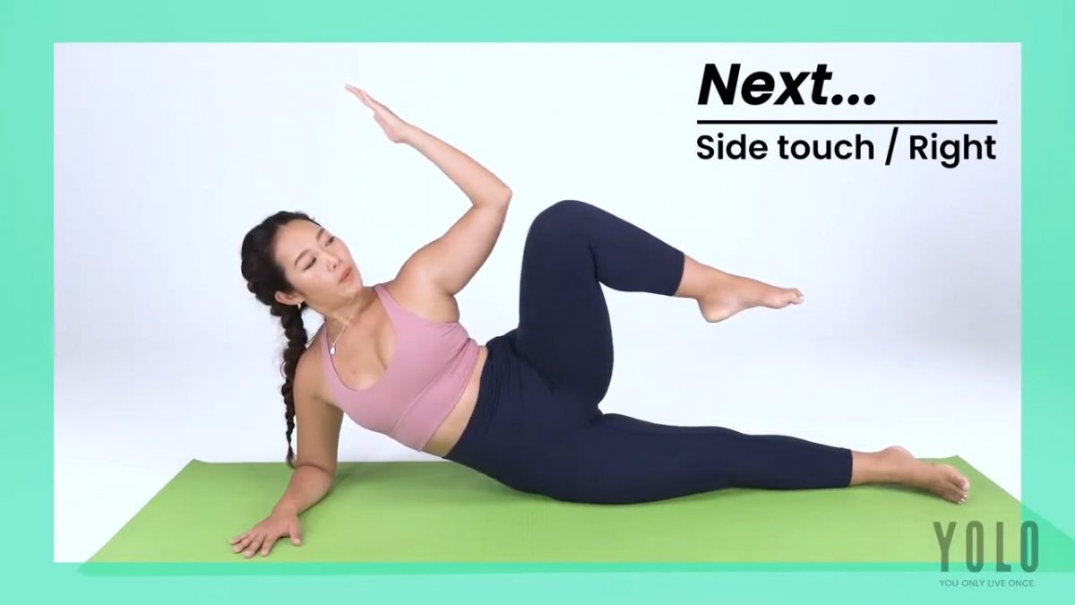 ヒジとお尻をマットにつけて、横向きになります。マットについていないほうのヒジとヒザを近づける動きを繰り返しましょう。左右それぞれ30秒ずつです。