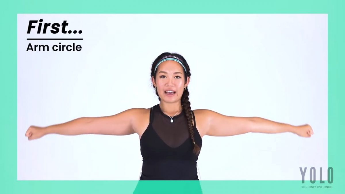両腕を肩の高さで一直線になるように伸ばします。肩を中心に、ぐるぐるを腕を回しましょう。前回しと後回し、15秒ずつ両方行います。