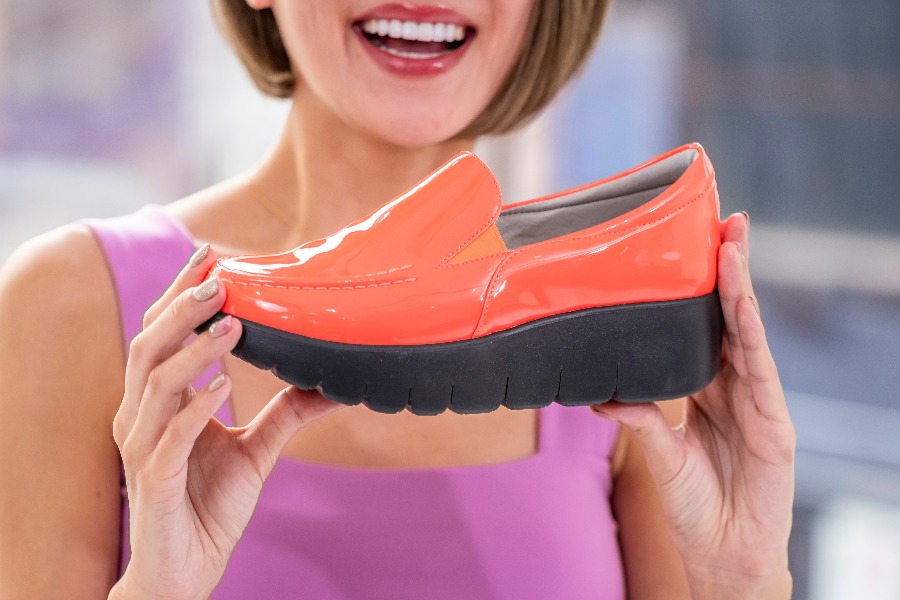 まず、5センチの厚底にすることで、視覚的な脚長効果があります。厚底というとカポカポっとかかとが脱げてしまうイメージがあるかもしれませんが、しっかりと靴底に切れ目を入れて屈曲できるようにして、足にホールドできるように工夫もしています。トレーニング効果の秘密は、インソール。内側に傾斜をかけることによって、O脚の人なども足首がまっすぐ立つし、それによって内ももの筋肉も使われるようになるんです。下半身の筋肉は全身の約70%を占めるとも言われているので、日常で脚のトレーニングが出来たら一石二鳥ですよね。