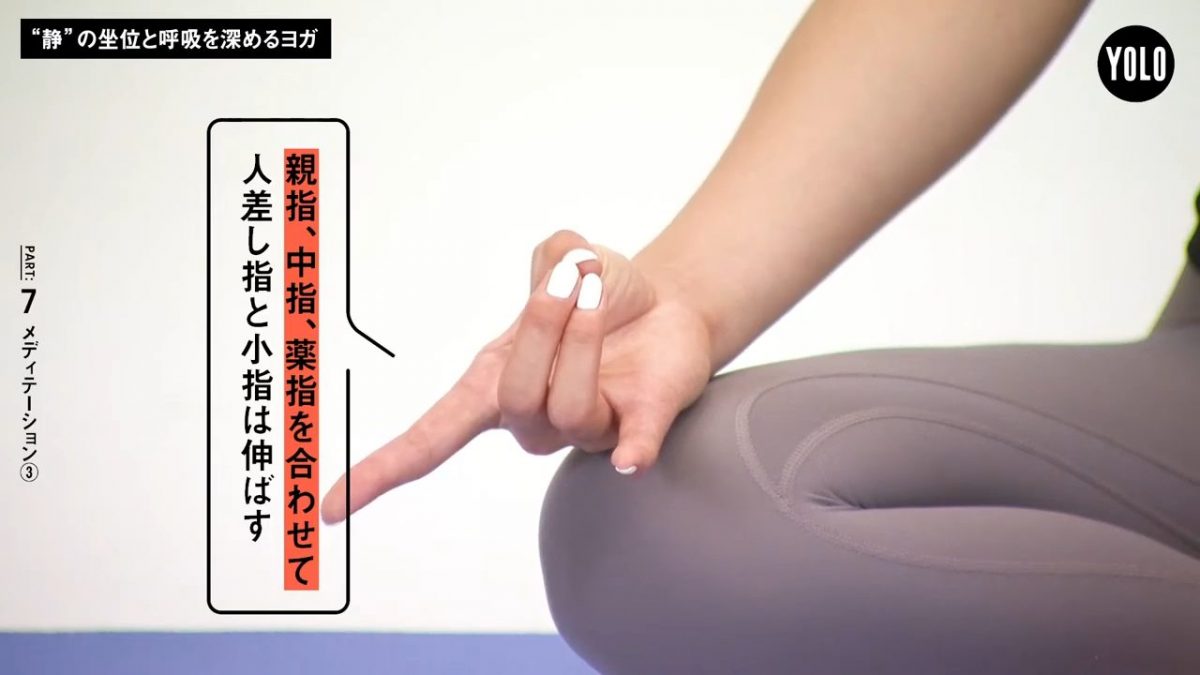 親指、中指、薬指を合わせ、人差し指、小指は伸ばします。鼻の奥からノドの奥を通って全身に届くような感覚で息を吸いましょう。背骨の一番下から背骨を通り、頭の先まで意識を向けます。