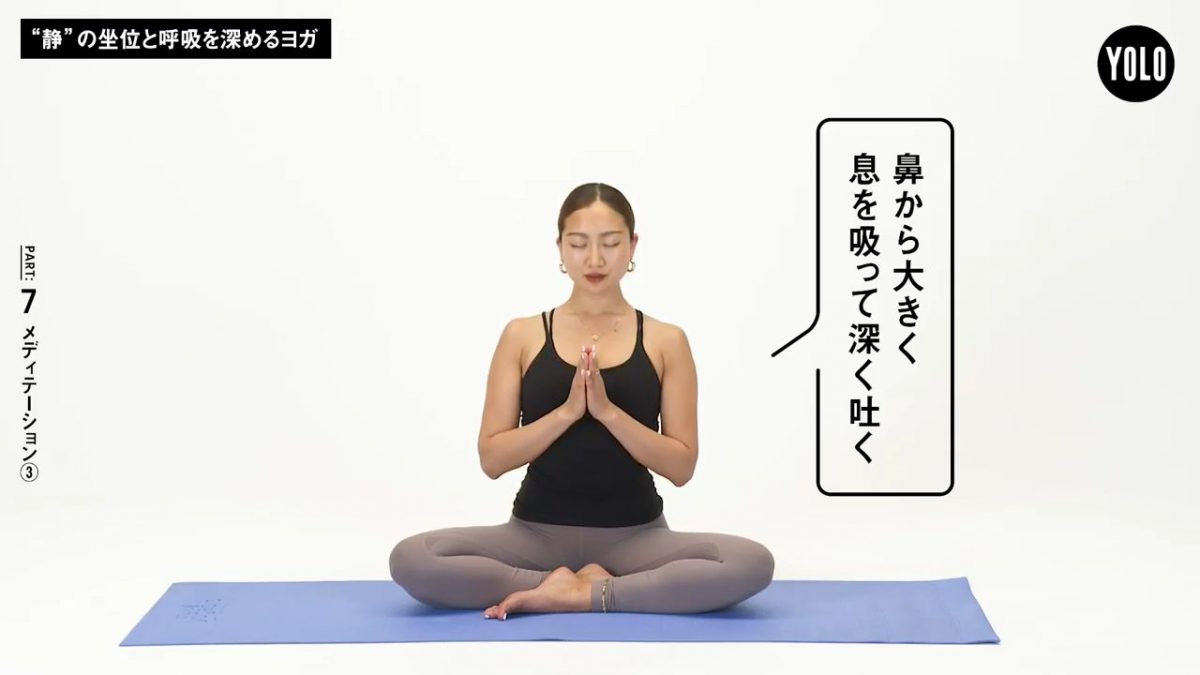 大きく呼吸をして意識を体に戻し、両手を胸の前で合掌。鼻から大きく息を吸って深く吐き、呼吸が落ち着いたら終了です。