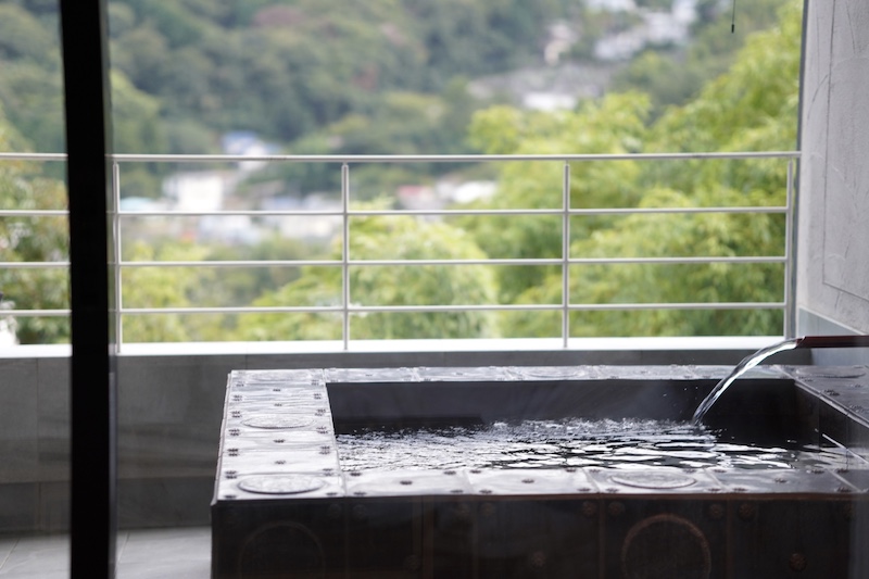 うつわ作家の郡司夫妻が焼き上げたという釉薬タイルの露天風呂には鹿と花の絵付けが施され、重厚感溢れるデザインで、湯船に湯河原の自然がたっぷり注がれていくよう。