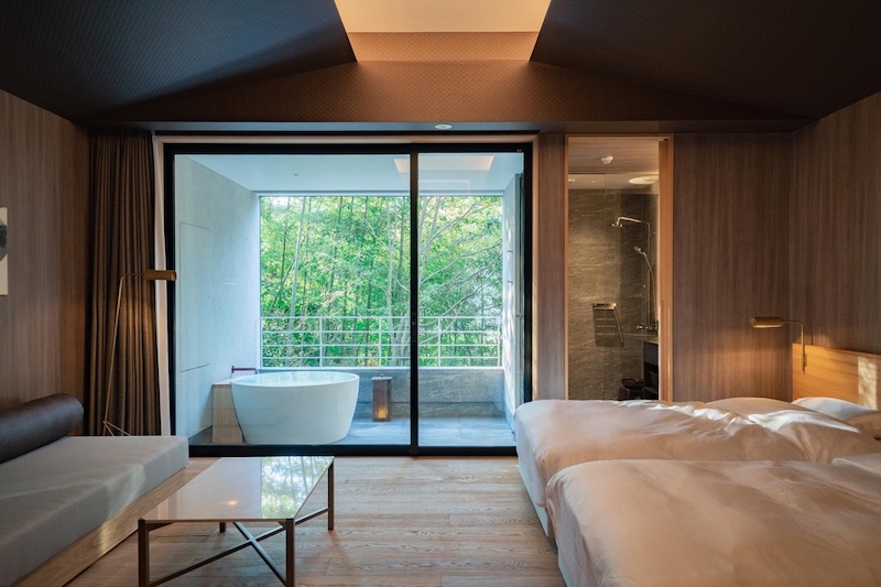 17ある客室は全て掛け流しの露天風呂を設え、デザインの異なる3タイプで構成されています。今回宿泊したのは1階に位置する「木立のツイン」。