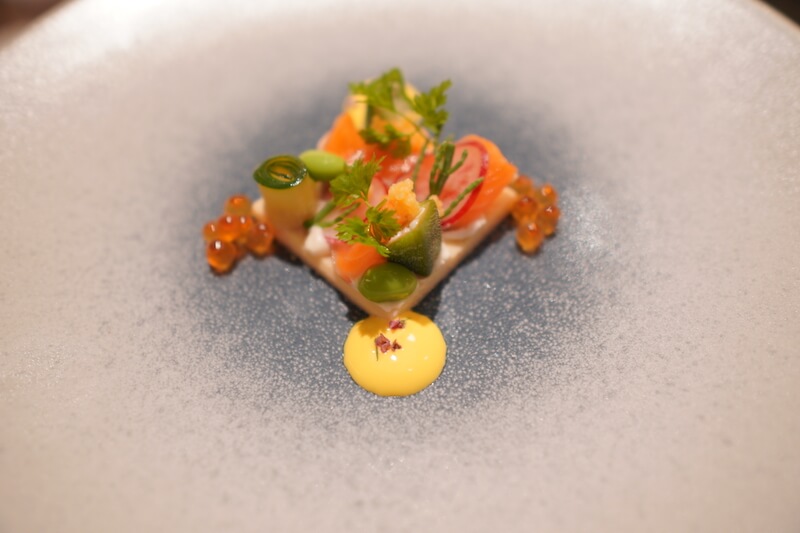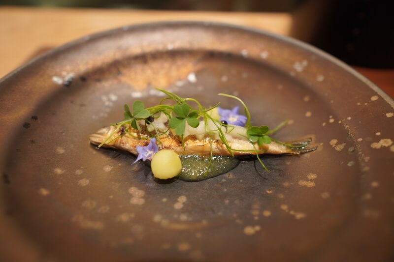 地元食材を使用した炭火焼きフレンチで、2カ月に1度メニューが変わるそう。この日は「大分県産トマト 国東半島のバジル」「湯布院サーモン 竹田サフラン」「佐伯酸真鯛 かぼすのブールブラン」「日田梨 湯布院チーズ工房のヨーグルト」など、地元出身のシェフが厳選した、地元の旬の食材を見事に使用した全6品のフルコース。