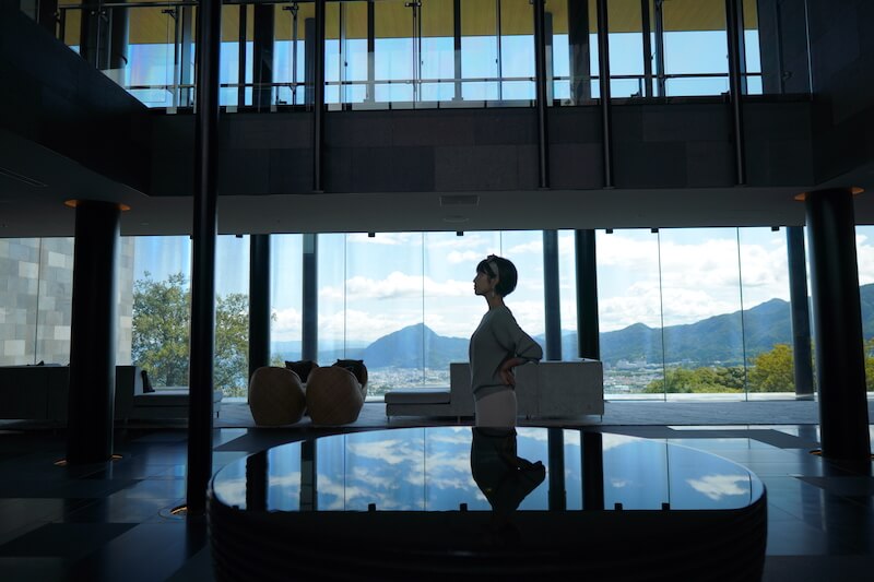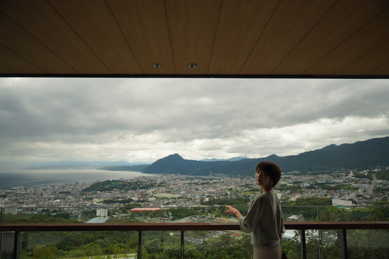 高さ11mにも及ぶ大きな窓の向こうには別府湾を見渡せるダイナミックな景色が広がり、到着を歓迎してくれるよう。