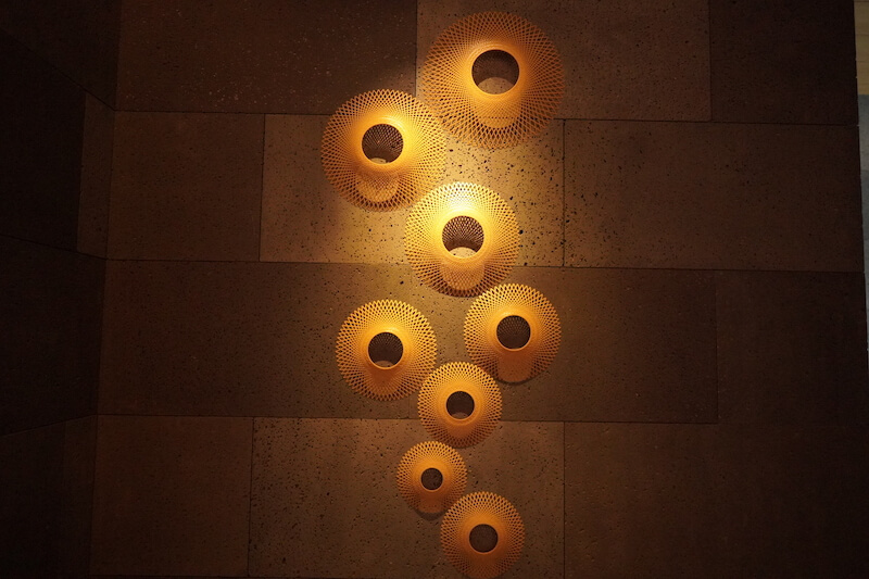 たとえば大分の竹細工のアートワークがあしらわれ、別府の街に時折かかる雲の様子を表現したり、別府の湯けむりをモチーフにしたカーペットや、木漏れ日を描いた黒のラインなど、まるで森の中を歩くように温もりのある空間を演出しています。大分県内の間伐材を大切に再利用し、命を吹き込みながら作品として昇華させているのです。