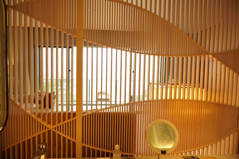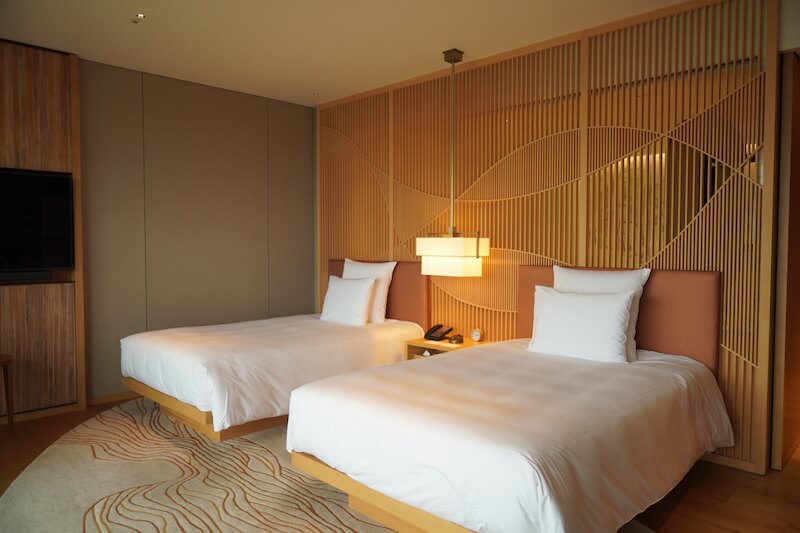 湯浴みを堪能した後は客室に戻ってリラックス。プレミアムツインでは、和のエッセンスと自然のエレメントを取り入れた68㎡のモダンな空間に、組子細工の引き戸で仕立てられたベッドルームがあります。