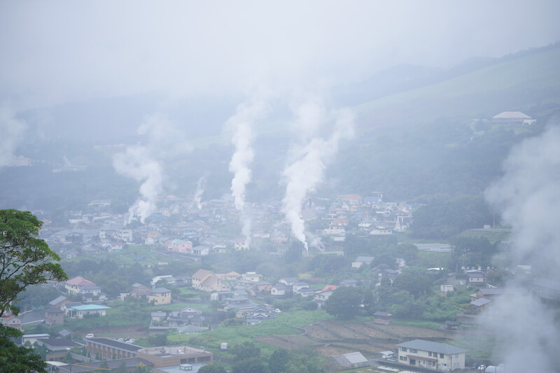 晴れた日は青い空に流れる雲、緑豊かな山々が美しく、雨の日は多くの温泉から白く昇る湯けむりが鮮明に見えて、それもまた風情があります。