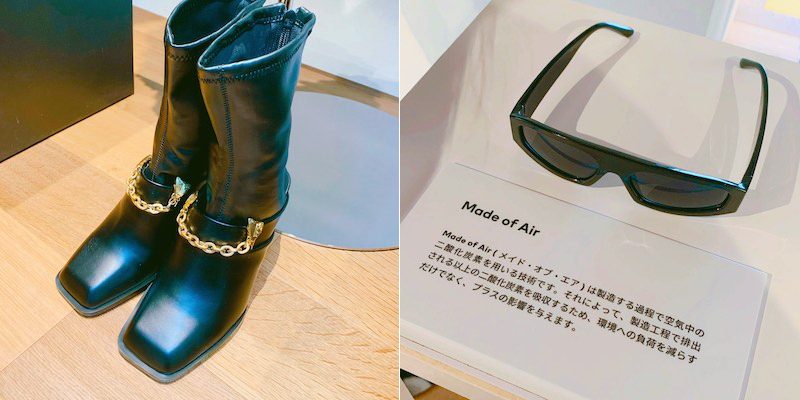 さらに、ワインを作る過程で発生した、廃棄されるぶどうの皮や種などを用いたグレープレザーのブーツ(写真左)や、製造過程で空気中の二酸化炭素を利用した技術を採用したサングラス(写真右)もあり、素材だけではなく、製造方法でもサステナビリティを実現!