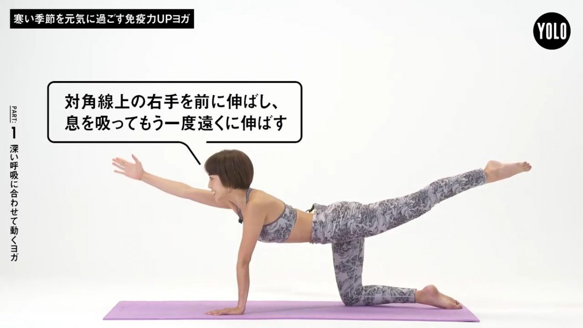 四つ這いの姿勢から、左脚を遠くに伸ばしお尻の高さにセットします。対角線上の右手を前に伸ばし、息を吸ってもう一度遠くに伸ばします。次は息を吐いてヒジとヒザを胸に引き寄せ、おへそを覗き込みます。これを何度か繰り返します。