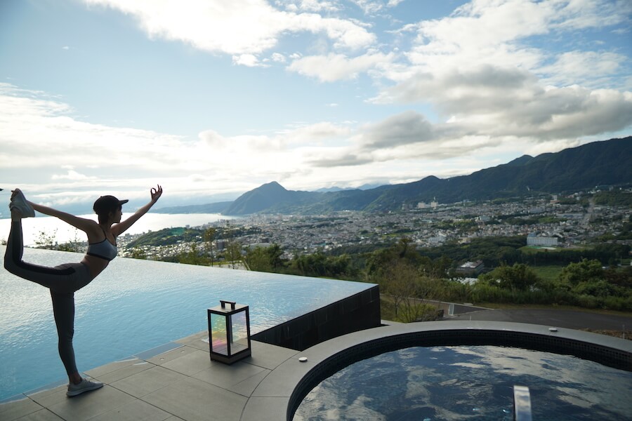 今回宿泊した「superior delux double」は、ベッドルームとリビングルームが一体となっていて、二人で過ごすには十分な空間づくり。小上がりになったデイベッドからは浅間山と明星ヶ岳、箱根の山並みを一望でき、お酒やコーヒーを飲みながらゆったりと寛げます。