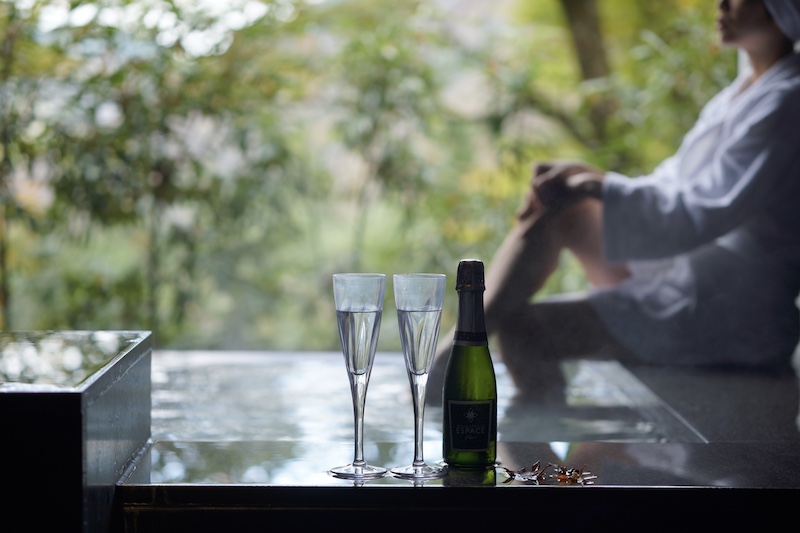 温かみのある「brown」とシックな「black」の2種類の部屋タイプがあり、バーカウンターを併設した貸切露天風呂を90分10,000円で利用できます。従来の温泉旅館でいう家族風呂にあたるのかもしれませんが、そのイメージとはかけ離れた、スタイリッシュでプライベート感満載な非日常空間です。