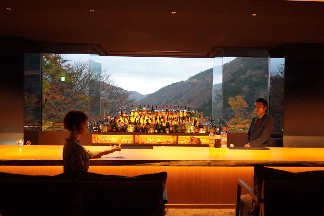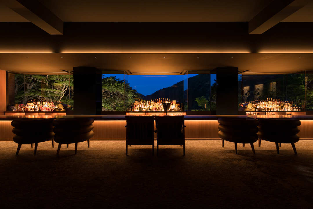 13mにもわたる一枚板の長いバーカウンターはオーセンティックな佇まいで、目の前には雄大な箱根の山々や暮色蒼然の空がパノラマに広がります。