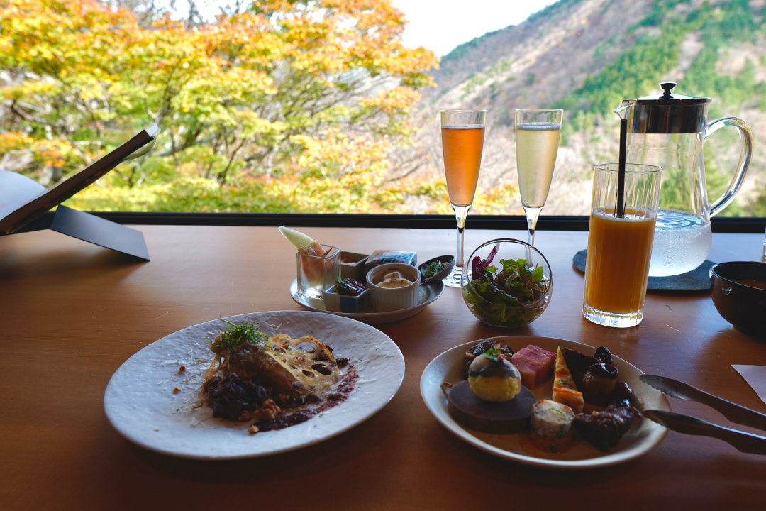 都心から新幹線やロマンスカーでわずか1時間半。ホテルまでの道中、登山鉄道やバスの車窓から紅葉が楽しめてちょっとした観光気分を味わえます。
