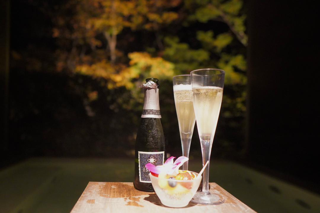 バーカウンターには冷えたボトルのスパークリングワインと、割れないようにプラスチック製のフルートグラス、バスローブ、アメニティなどが用意されています。