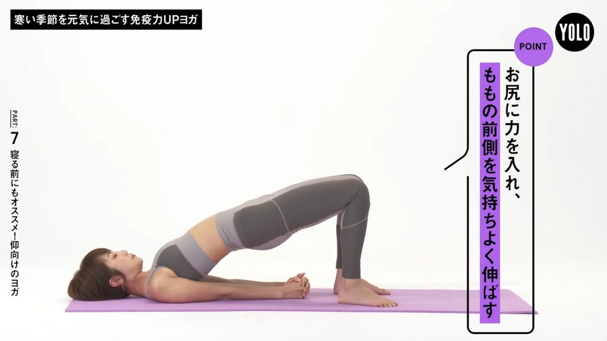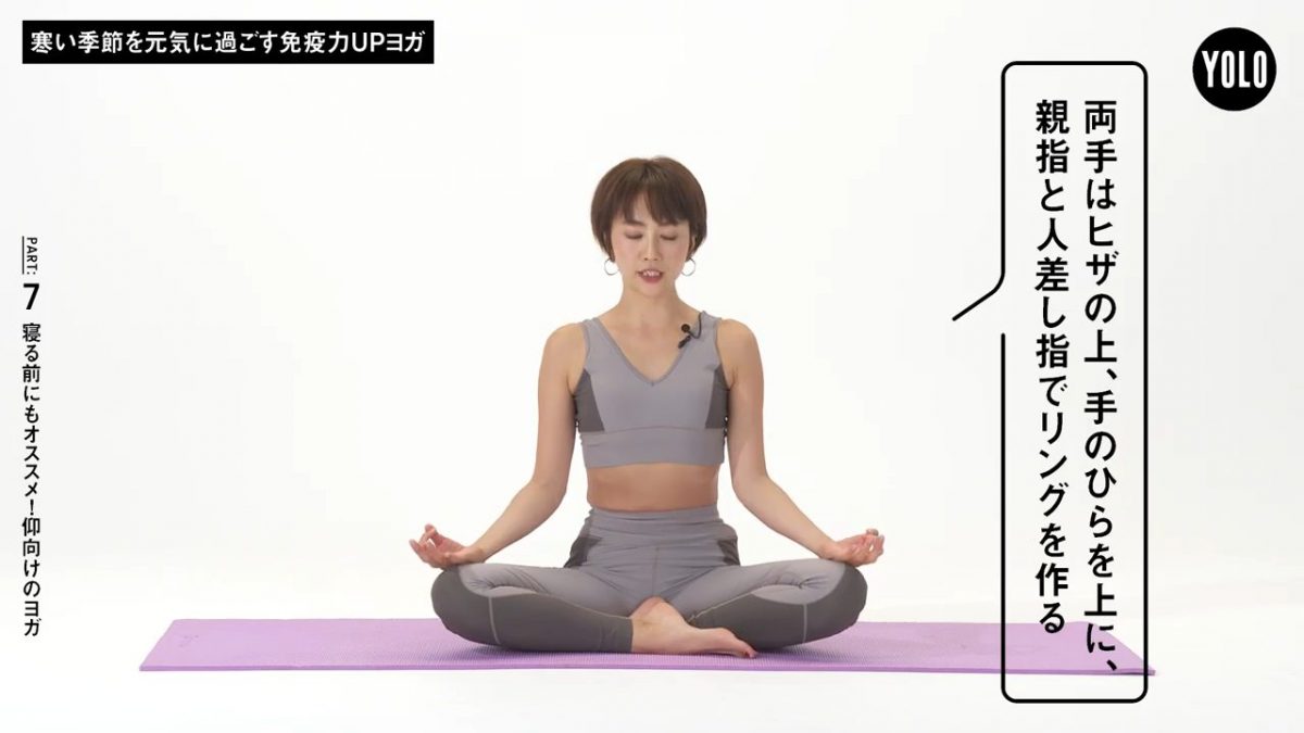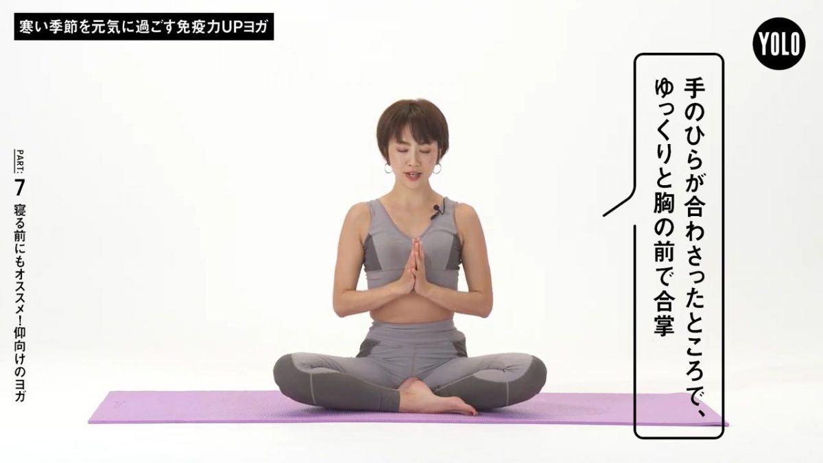 ヨガで体を動かすと、ポカポカと温まって基礎代謝が上がります。ヨガを通じて、風邪などの病気に負けない体を作っていきましょう。体が温まるだけでなく、姿勢や呼吸の改善にもつながるので、体の調子がきっと整うはず。このシリーズでは、「仰向け」や「逆転」など、姿勢ごとに7回に分けてヨガをご紹介しています。
