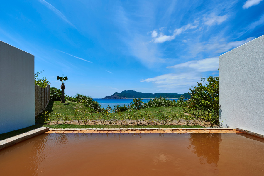 源泉が敷地内にあり、泉温は25.5℃、湯船の湯は約40℃に保たれ、南国ならではの気候で冬でも寒さを気にせず湯浴みできます。泉質は、塩分の作用で湯冷めしにくいナトリウム・カルシウム-塩化物泉。身も心もポカポカ温まり、心地よい眠りを約束してくれます。