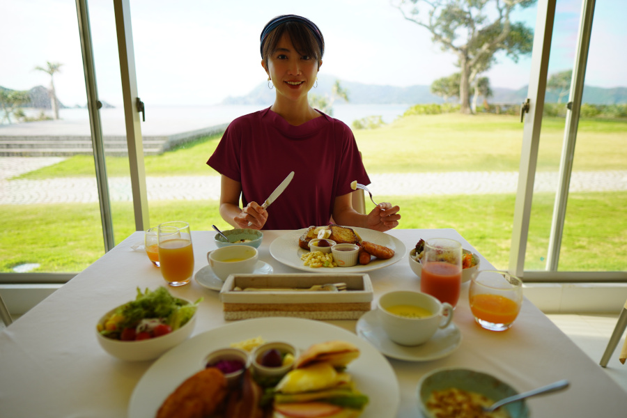 翌日の朝食では、目の前に広がる海を眺めながら、プレート形式(日替わり和食/洋食)やビュッフェスタイルでいただけます。メインはフレンチトーストやエッグベネディクトからセレクトできます。今の季節しか収穫できない奄美産のタンカンをその場で絞ったフレッシュジュースは、起きぬけのリフレッシュメントとして最適です。
