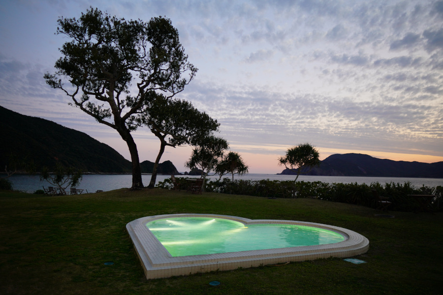 眼下にはハート型のプール、緑生い茂るガーデンが広がり、海を180°パノラマに見渡せて、空を近くに感じられます。晴れた日は対岸の加計呂麻島を鮮明に望むことができます。