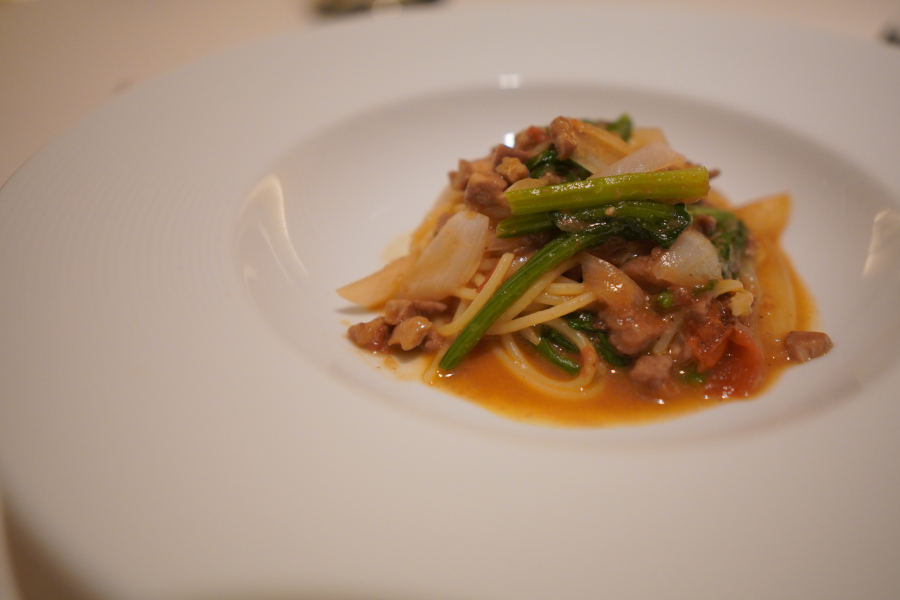 - 薩摩赤鶏とポルチーニのラグー ほうれん草と新玉葱のスパゲッティーニ