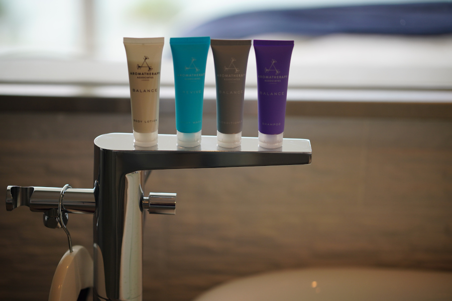 ミニバーにあるドリンクは全てコンプリメンタリー、アメニティーは英国生まれのAromatherapy Associations、テレビモニターの代わりにプロジェクターを採用するなど、部屋の細部にこだわりを感じられます。