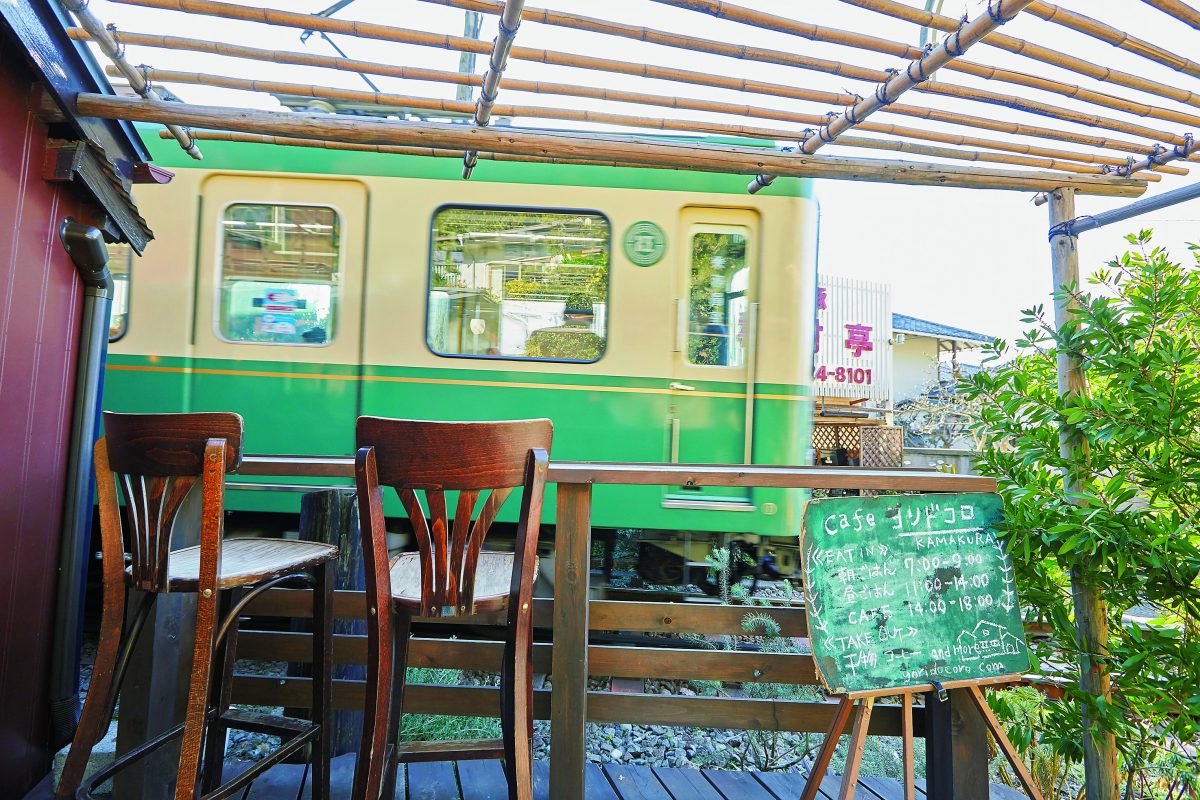 鎌倉の絶景は自然のなかだけではありません。干物とコーヒーをウリにしたカフェ「ヨリドコロ」では、江ノ電をすごく間近で見ることができます。電車好きにはたまりません!