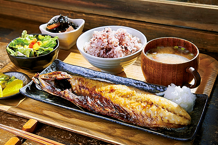 カフェのテーマは「鎌倉の日常を旅する」。非日常を求めて旅にきた人々に、ごく当たり前の鎌倉の日常を体験してほしいとの思いが込められています。また、オーナーの実家が干物専門店ということもあり、常時新鮮な干物を提供。コーヒーにもこだわり、稲村ガ崎にあるツバメコーヒー焙煎所の豆を使用しています。気になるランチの干物定食は、鯵、えぼ鯛、塩鯖などの干物に、日替わり小鉢2品、ご飯(白米 or 十穀米)、麦味噌をブレンドした味噌汁など。観光の合間に、地元の食材をたっぷり使ったおいしい和食を召し上がれ♪