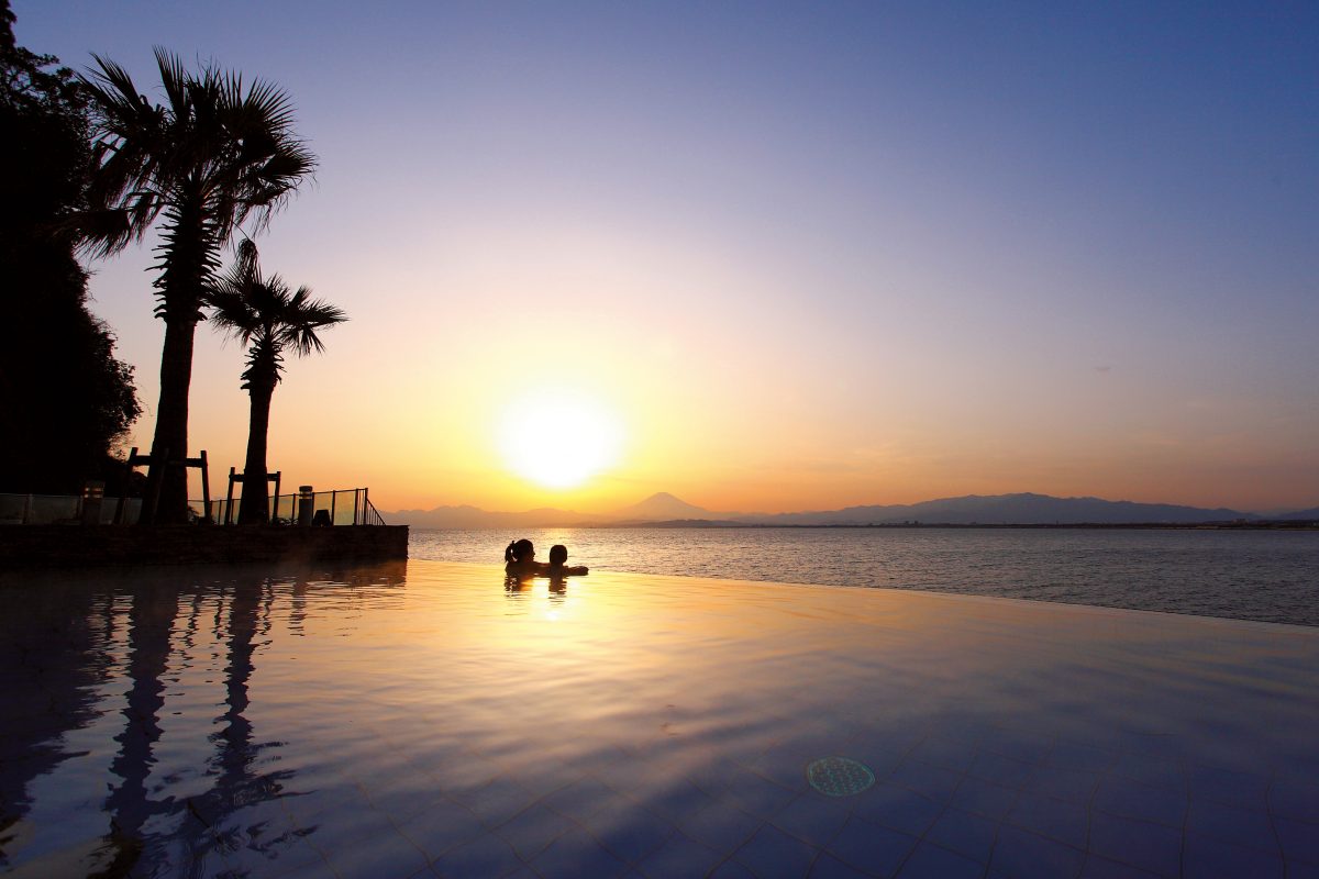 癒しはもちろんですが、注目はなんといっても湘南の海や雄大な富士山が望める「露天プール」。サンセット時の水平線の眺めは、言うことなし! 他にも外の景色をたっぷりと楽しめる「富士海湯」や、ジャグジーや気泡泉が楽しめる「洗芯泉」エリア、解放感あふれる吹き抜けや空から差し込む光によって照らされたハイビスカスが美しい「天陽泉」エリアも必見です。
