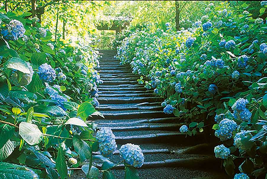 もうひとつ、忘れてはならない見どころは紫陽花。鎌倉石の参道脇を青く染める紫陽花は例年6月10日~6月末あたりが見頃で、シーズン中は人々が列をなすほどの大盛況に。階段下からカメラをかまえれば、美しい紫陽花の絶景を撮影できます。