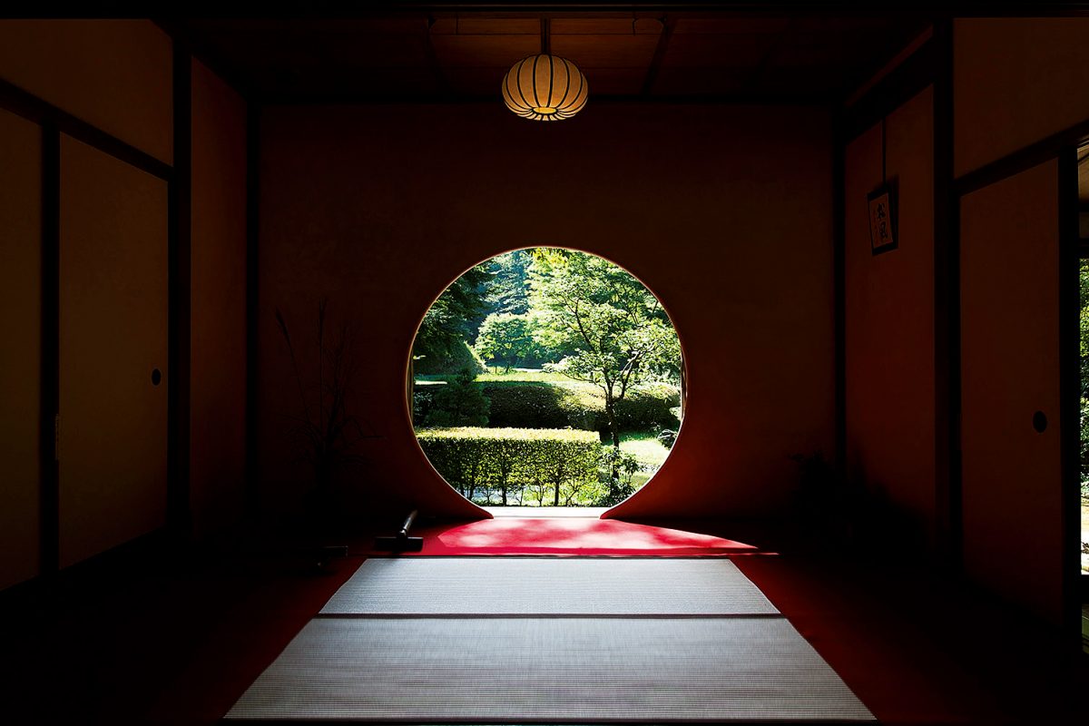 起源は1160年創建の明月庵。その後、鎌倉幕府8代執権の北条時宗が最明寺を前身として禅興寺を創建し、その塔頭(子院)として明月院と改められました。通常は立ち入れない後庭園の絶景を眺められる本堂の丸窓は、明月院屈指の見どころ。丸(円)は悟りの象徴とされていることから「悟りの窓」の名で知られ、見る者を禅の世界へと誘います。