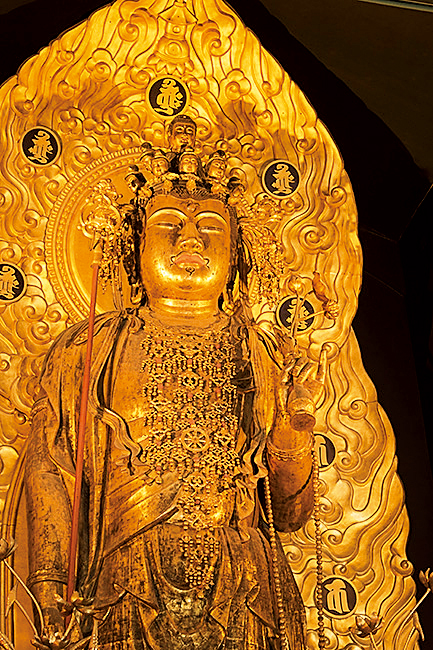 境内はふたつの池の回遊式庭園となっており、自然を散策しながら仏像が祀られたお堂を見て回ることができます。さらに奥へ進むと、海と街並みが一望できる見晴台も。時間をかけて散策したいあじさいのスポットです。また高さ9.18mの日本最大級の木彫仏、十一面観世音菩薩像が祀られている「観音堂」も必見。独特の姿をしており、「長谷寺式」と呼ばれています。