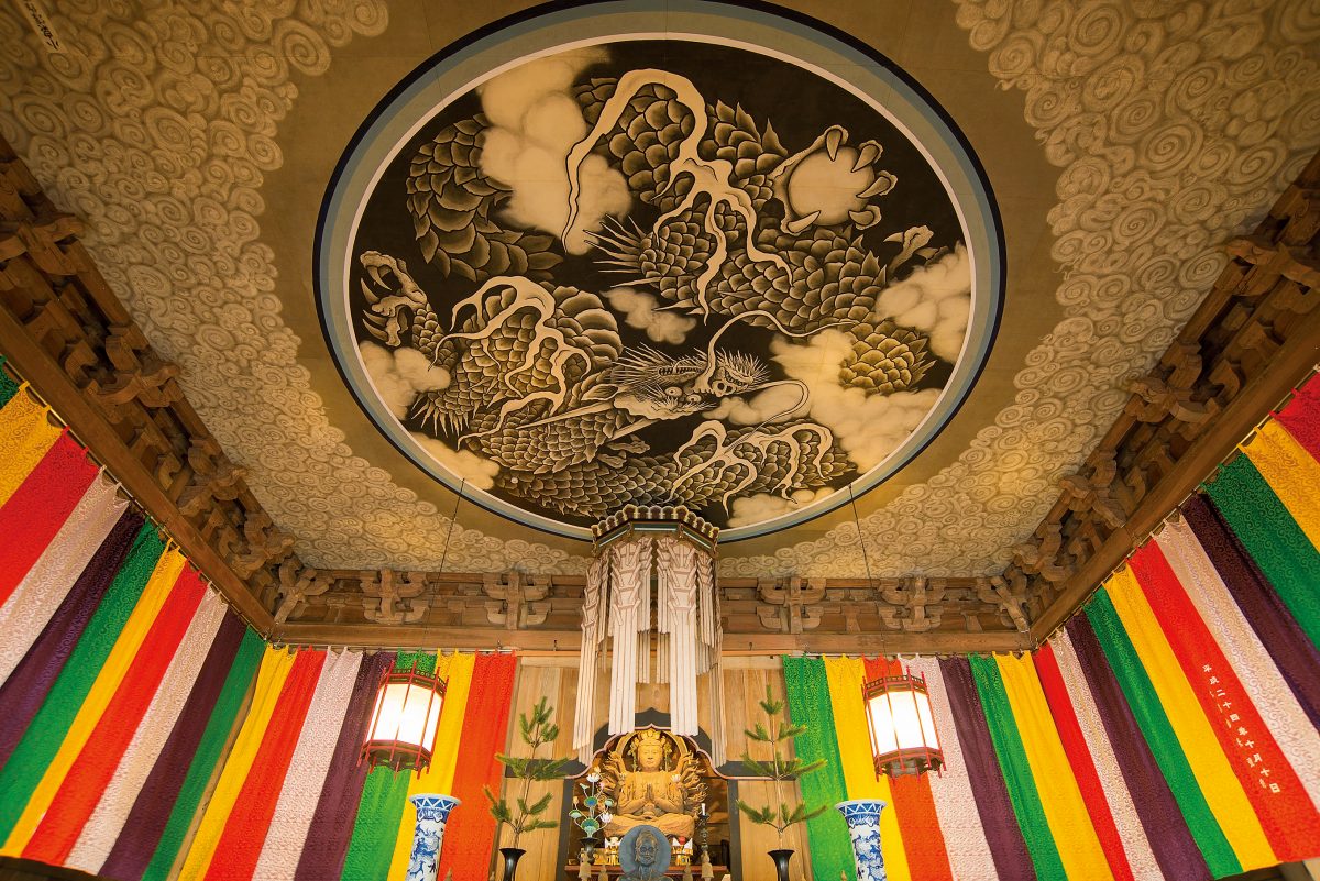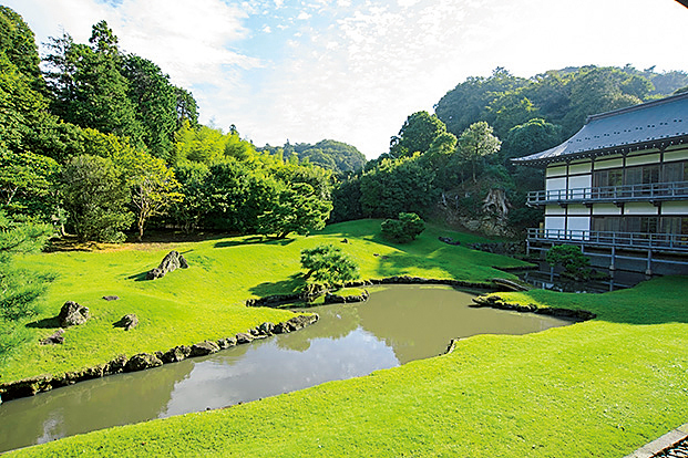 法堂に入って天井を見上げれば、迫力満点の『雲龍図』が。鎌倉に住んでいた日本画家、小泉淳作氏の描いたもので、その力強い筆致は圧巻の一言!さらに開山の蘭渓道隆作といわれる方丈庭園は、禅の心を視覚で楽しめます。草書体の「心」の字をかたどった「心字池」を眺めながら、しばし心を静めてみては?