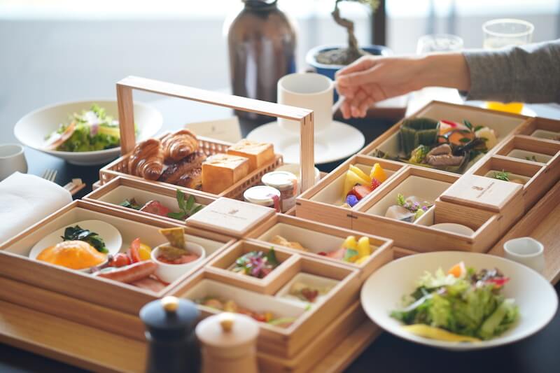 「Craftmanship(クラフトマンシップ)」をコンセプトに、日本の歴史や文化、伝統技巧に敬意を込めて、ジュエリーボックスに見立てたというホテル特製の木箱には、一品一品丁寧に大切に調理された料理が詰められています。ふたり旅なら和食と洋食を一種類ずつ選べるのも嬉しいポイント。