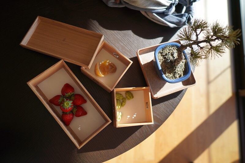 テーブルの木箱には、完熟した真っ赤な苺がウェルカムスイーツとして置かれていて、隅々まで行き届いたサービスがこの滞在を上質なものにしてくれます。