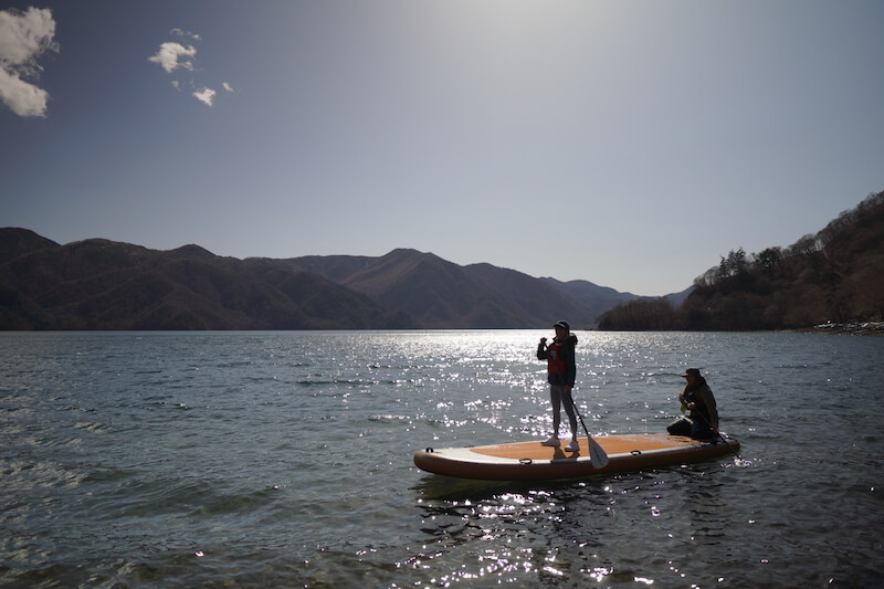 今回は中禅寺湖で「SUPエクスペリエンス」を。SUPというと1-2人で乗るSUPボードが定番ですが、家族やカップル、友人同士でも楽しめる長さ5mのメガボードに挑戦しました。インストラクターの方が同乗して一緒に漕いでくれるので安心です。