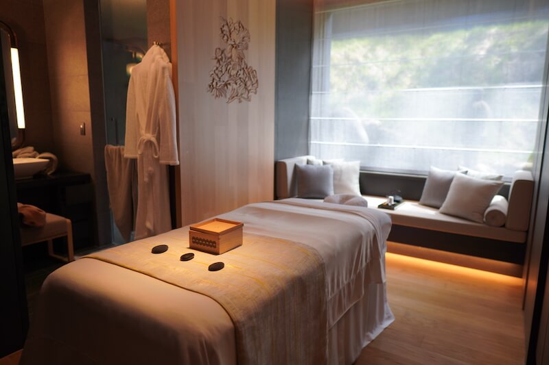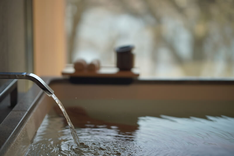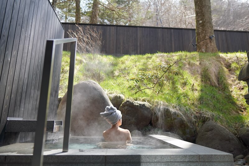次に、温泉付きの静かなプライベートスパルームに移動し、露天風呂に浸かって体の芯から温めます。単純硫黄泉で美肌の湯として知られる湯元温泉は、源泉は無色透明、地上で空気に触れることにより乳白色のにごり湯に変わるのが特徴。冷え性や疲労回復にも効果的だそう。