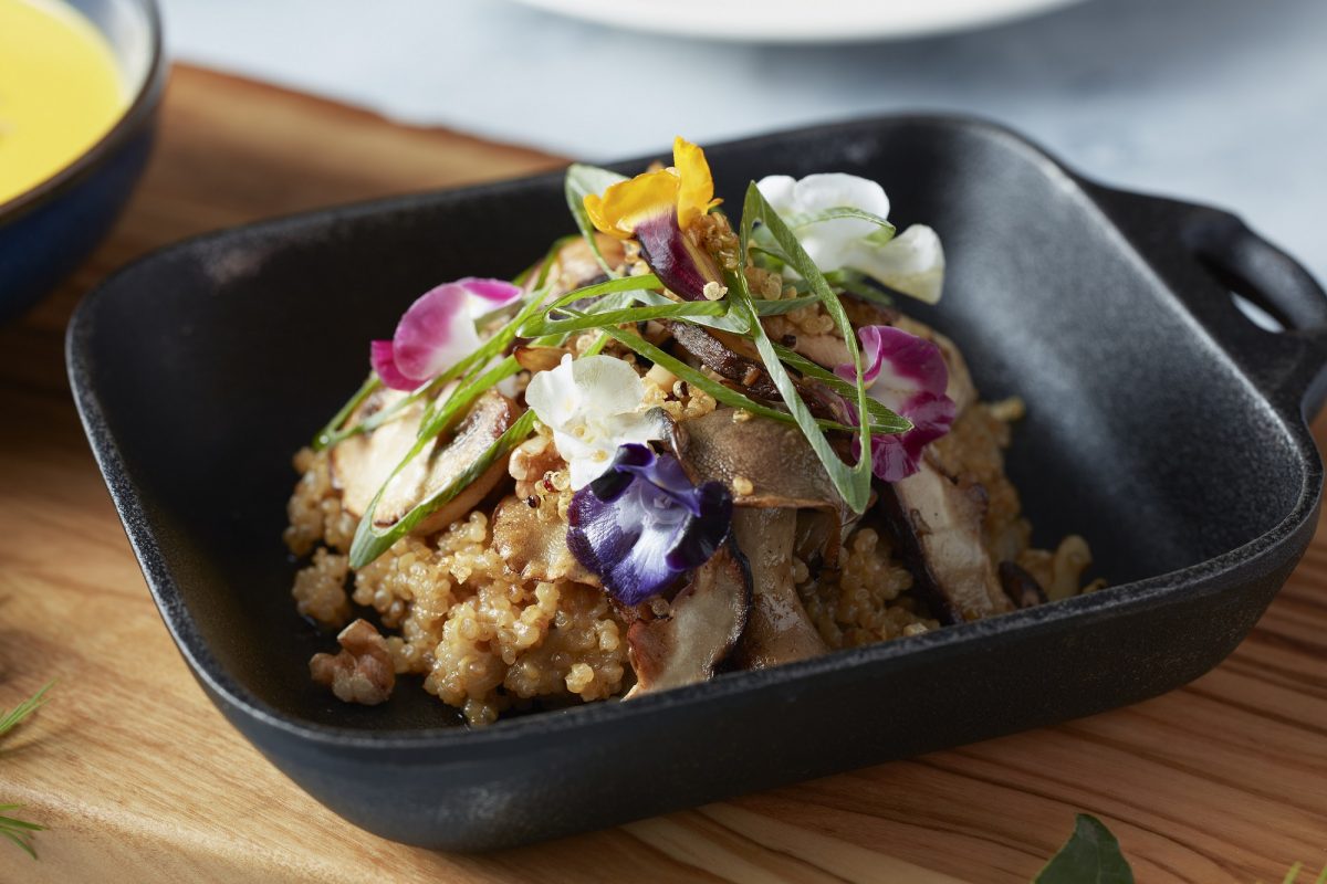 食物繊維とタンパク質が両方含まれているキヌアは、プチプチした食感が楽しく、少しの量でも満足感が得られます。「キヌアと江戸甘味噌のきのこリゾット 東京都産柚子胡椒」は、キノコをたっぷり使用し昆布出汁・醤油・江戸甘味噌で親しみやすいテイストに仕上げ、東京都産柚子胡椒の辛みがアクセントにきいています。