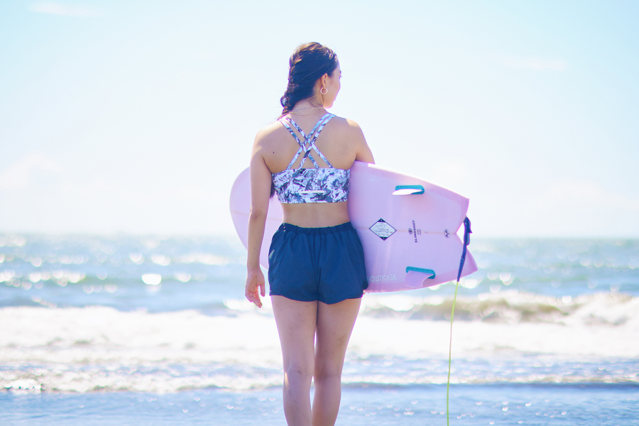サーフィンって波の状態によってカラダの動きを激しく変えていかなくてはならないスポーツなので、ズレが限りなくゼロであってほしいんです。ドルフィンスルーを行っているときに水着がズレてしまうと、それだけでパフォーマンスはダウンしてしまいます。水着を押さえながら波の下をくぐり抜けなきゃいけないから、集中できないんですよね。それに、まわりに人がたくさんいるのに、水着がズレたりしたら恥ずかしいじゃないですか。過去にはそれが嫌で、水着の上にTシャツを着て練習することもありました。