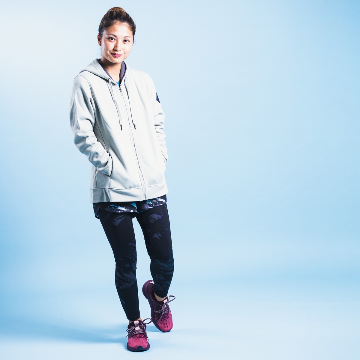 運動強度が低いゆったりとしたジョグなら、フーディーを組み合わせた街着パターンもアリ。見た目の印象を左右するシューズの素材感にまでこだわり、そのいっぽうで、タイツやショーツ、アンダーにはしっかりと機能性ウエアを組み合わせるという、サロモンならでの全身コーデです。そのままコンビニにも行けちゃうカジュアルスタイルは、つい「近所はいつもコレ!」というほどヘビロテ間違いなし。