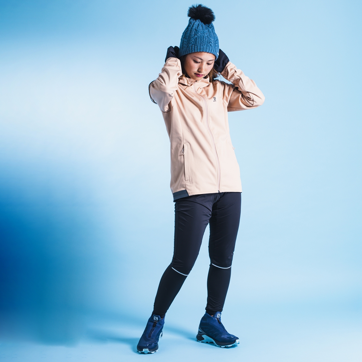 真冬のランニングは、走りたいけど寒い……!というジレンマに。そんなときに助けてくれるコーデパターンがこちら。サロモンは創業以来ウインタースポーツを得意とするブランドでもあるので、防風性と防水性の高さはお墨付き。それでいて、スマートなシルエットと動きやすいデザインを両立しているのがポイントです。かわいらしいビーニーは、スキーやスノーボードなどのゲレンデシーンにも似合いますね。