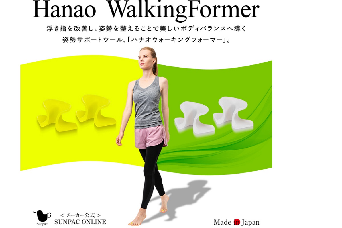 まずはウォーキングフォームから見直したいという人におすすめしたいのが、「ハナオ ウォーキングフォーマー」だ。このアイテムは、足の親指と人差し指の間に挟んで歩くだけで、正しい姿勢が身につくサポートツール。装着することで、重心が前になり、自然と姿勢が改善され、正しいボディバランスに導いてくれるという優れものだ。