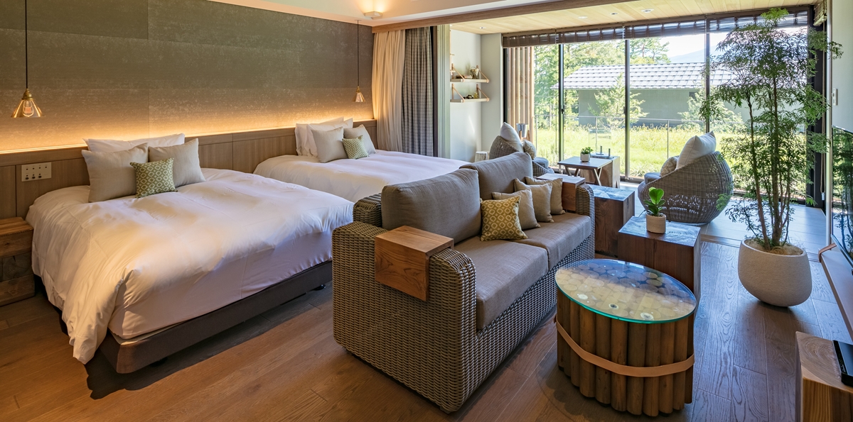 スイートルーム(全32室)は6タイプあり、どの部屋からも富士山の絶景を一望できます。河口湖の森の命を繋ぐアメニティや、客室露天風呂も備え、まるで自宅にいるかのような快適さと、非日常のラグジュアリーな気分を同時に満喫できる新感覚リゾート。レストラン「山のは」で味わう、地産地消の美食体験も見逃せません。